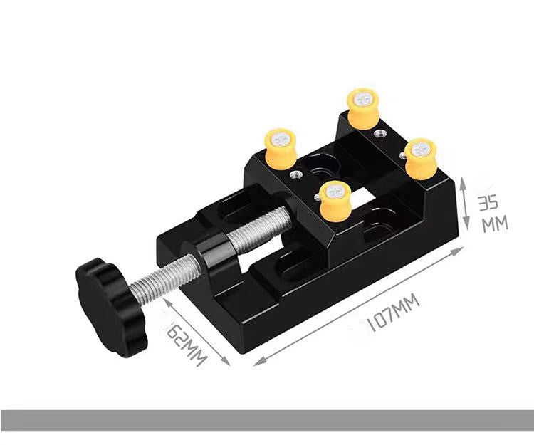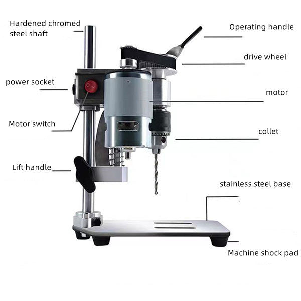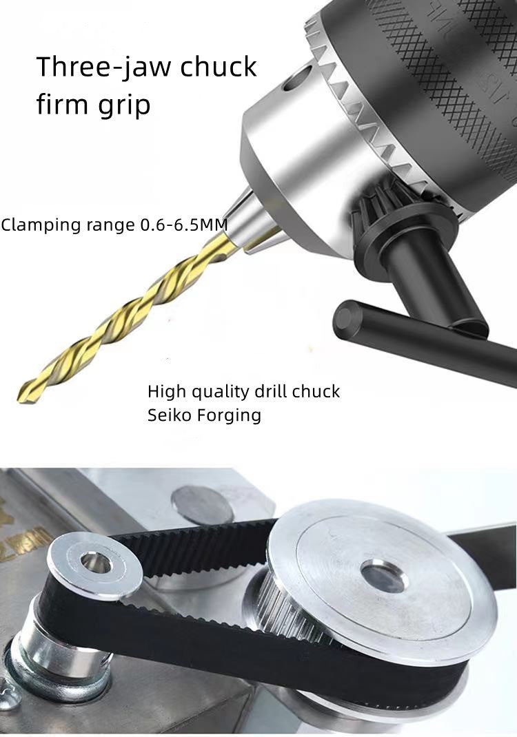 Name: Small Mini Bench Drill Speed regulation: Seven gears Speed: (1150--2300 rpm) Collet type: Universal collet clamping range (0.5- -6mm) Input voltage: DC12- -24V Size: 220* 150*100mm